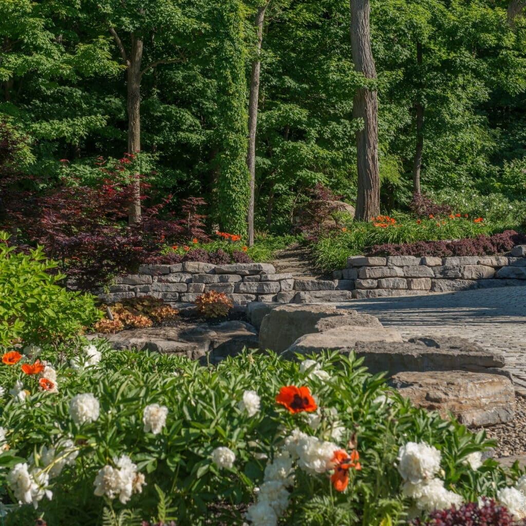 Terrasses en bois ou en pierre naturelle, allées en pavés, murets de soutènement.